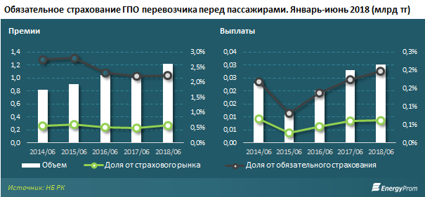 Поступления по страховым премиям по обязательному страхованию ГПО перевозчика перед пассажирами также растут, и составили за январь-июнь 2018 года 1,2 млрд тг, что на 21,6% больше, чем за январь-июнь 2017 года. Удельный вес от премий по обязательному страхованию за год не изменился и составил 2,2% от всех собранных премий, за год вырос с 0,5% до 0,6%.