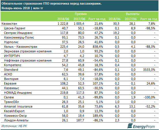 Среди страховых компаний РК самое большое поступление премий по обязательному страхованию ГПО перевозчика перед пассажирами у «Халык-Казахинстрах» — 225,4 млн тг, что в 9 раз больше чем за январь-июнь 2017 года, при этом объем выплат составил лишь 478 тыс. тг, против 4,1 млн годом ранее.