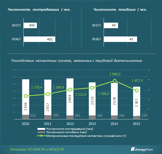 Год за годом показатели производственного травматизма все менее пессимистичны. Так, по сообщению МТиСЗ РК, за первый квартал 2017 года от несчастных случаев на производстве пострадало на 14,7% меньше, чем за аналогичный период 2016 года — 342 человека. Число смертельных исходов снизилось за год на 8,5%, до 43 человек.