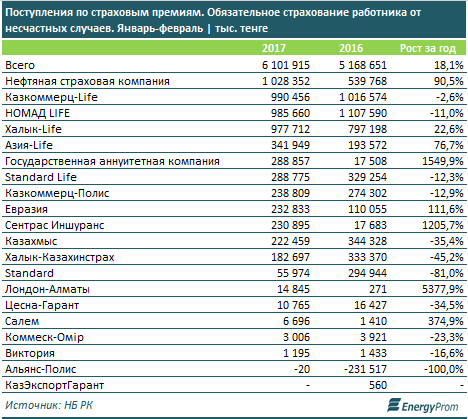 За январь-февраль по обязательному страхованию работников от несчастных случаев страховые компании собрали премии в размере 6,1 млрд тг — это на 18,1% больше, чем годом ранее. Наибольший объем страховых премий пришелся на АО «Нефтяная страховая компания» (16,9% от РК, 1,03 млрд тг — плюс 90,5% за год), «Казкоммерц-Life» (16,2% от РК, 990,5 млн тг, минус 2,6% за год) и «Номад Life» (16,2% от РК, 985,7 млн тг, минус 11% за год).