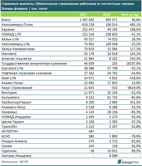Объем страховых выплат в сегменте обязательного страхования работников от несчастных случаев увеличился за год на 60,8%, до 1,6 млрд тг. Тройка лидеров по выплатам — «Казкоммерц-Полис» (38,7% от РК), «Евразия» (15,8%) и «Номад Life» (9,5%).