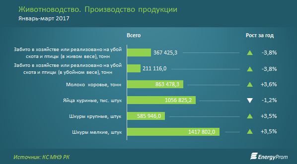 Рост отмечен практически по всем категориям продукции в АПК. Так, забой и реализация скота и птицы в живом весе увеличилось на 3,8%, до 367,4 тыс. тонн. Почти половину (49%) составил крупный рогатый скот, еще 15% — овцы, 14% — птица и 11% — лошади. 45,9% обеспечила ведущая тройка областей. Показатель в убойном весе вырос также на 3,8%, до 211,1 тыс. тонн.