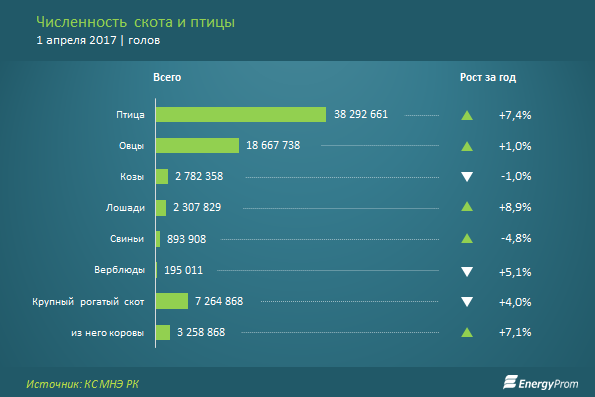 Численность КРС выросла за год на 4%, до 7,3 млн голов на 1 апреля 2017, из него коров — 2,3 млн голов, +7,1% за год. Поголовье лошадей увеличилось на 8,9%, до 2,3 млн, верблюдов — на 5,1%, до 195 тысяч, овец — на 1%, до 18,7 млн. Количество птиц выросло на 7,4%, до 38,3 млн.