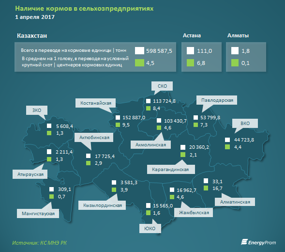 61,8% запасов сконцентрировано в Костанайской, Северо-Казахстанской и Акмолинской областях — главных житницах страны.