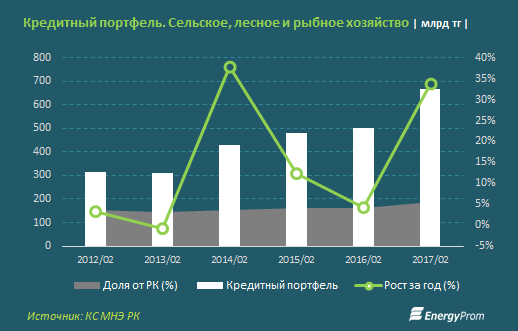Кредитный портфель АПК вырос по итогам февраля сразу на 33,7% за год, до 668,8 млрд тг. В феврале 2016 ссудник сектора составлял 500,1 млрд тг, на 4,3% больше, чем годом ранее.
