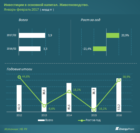 Инвестпортфель также в фазе роста: инвестиции в основной капитал животноводства за январь-февраль 2017 составили 3,9 млрд тг, на 20,9% больше, чем в аналогичном периоде прошлого года. По итогам 2016 года капвложения достигали 53,2 млрд тг, на 38,9% больше, чем в 2015.