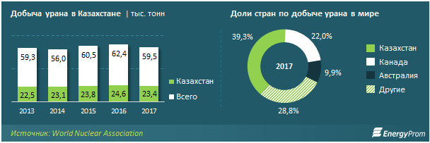 Напомним, Казахстан — самый крупный добытчик урана в мире. Так, в 2017 году Казахстан добыл 39,3% от мировой добычи урана*, на втором месте была Канада (22% от мировой добычи), на третьем — Австралия (9,9%). Тройка лидеров обеспечила 71,2% от мировой добычи урана.