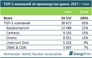 По данным Всемирной ядерной ассоциации в 2017 году пять крупных мировых компаний, производящих уран, обеспечили 65% мирового производства. Крупнейшая из них — АО «НАК „Казатомпром“» — обеспечила 21% мирового производства урана.