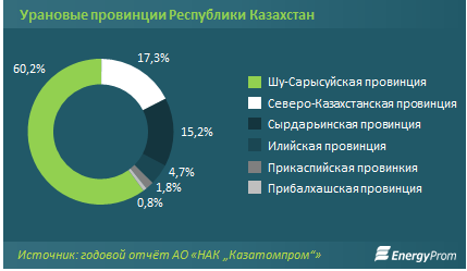 По данным последнего годового отчёта «Казатомпрома»* три основные урановые провинции обеспечили 92,7% от общей добычи в Казахстане. На первом месте Шу-Сарысуйская провинция (60,2%), на втором — Северо-Казахстанская провинция (17,3%), на третьем — Сырдарьинская провинция (15,2%).