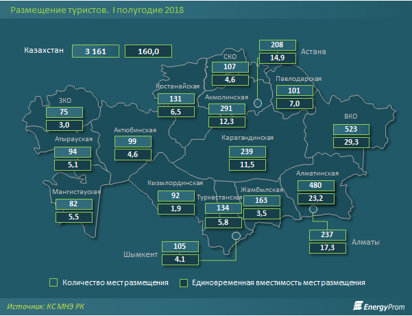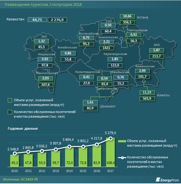 По данным агентства howmuch.net, в прошлом 2017 году туристы оставили в РК 1,78 миллиона долларов — страна на 78 месте из 143 в рейтинге по этому показателю. Для сравнения, в занимающих первое место в рейтинге США поступления от международного туризма достигли 210,75 млн долл, а в России, находящейся на 34 позиции — 8,95 млн долл.