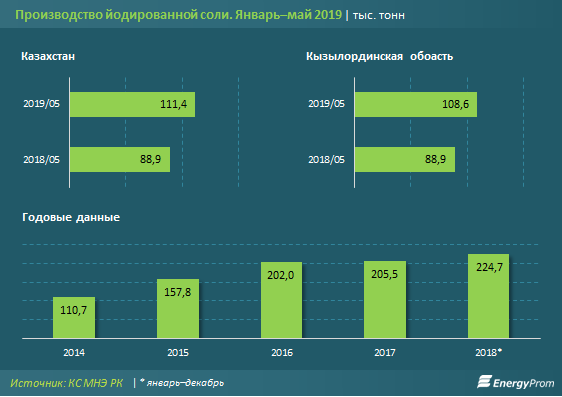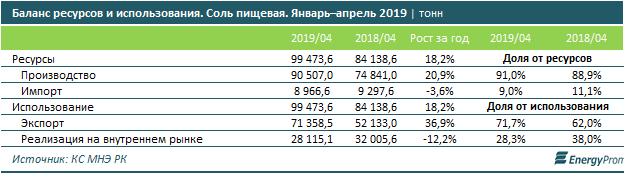 В РК соль импортируют мало: местное производство по итогам января–апреля 2019 года обеспечило 91% спроса. Более того, перекрыв внутренний рынок, казахстанские компании наращивают экспортные поставки: плюс 36,9% за год, до 71,4 тыс. тонн.