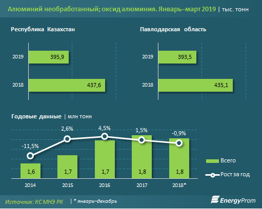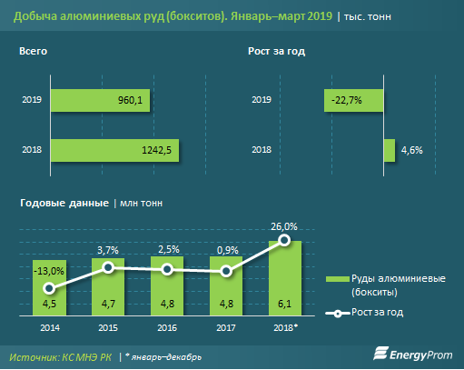 В I квартале текущего года, согласно информации Комитета по статистике МНЭ РК, добыча алюминиевых руд сократилась сразу на 22,7% за год, до 960,1 тыс. тонн. Крупнейшее предприятие отрасли, занимающееся добычей и обогащением бокситов на Торгайском бокситовом рудоуправлении (ТБРУ) и Краснооктябрьском бокситовом рудоуправлении (КБРУ) в Костанайской области — АО «Алюминий Казахстана». Это единственная в Казахстане компания, выпускающая сырьё для производства алюминия — глинозём*. Предприятие входит в группу компаний Eurasian Resources Group (ERG).