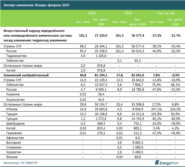 Продажи необработанного алюминия на внешние рынки за 2 месяца 2019 года в натуральном выражении увеличились на 7,8%, однако в денежном сократились на 0,9%. Главные импортёры алюминия — Италия, Турция и Узбекистан.