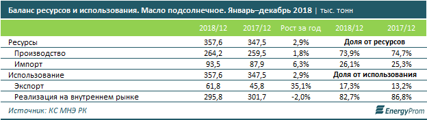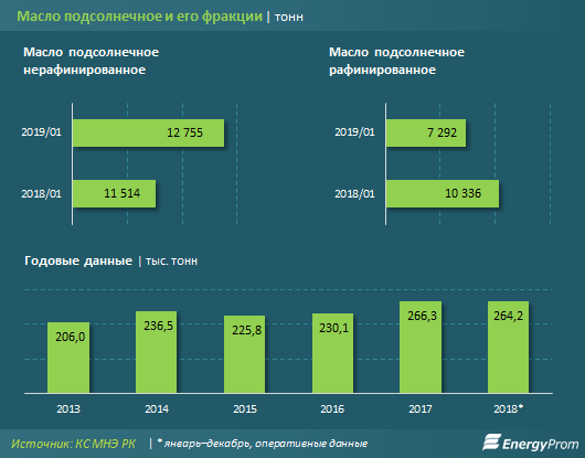 Основная доля производства подсолнечного масла приходится на ВКО: 82,4% от всего нерафинированного по РК (10,5 тыс. тонн, +11,8% за год) и 71,5% — от рафинированного (5,2 тыс. тонн, −21,7% за год)