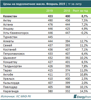 К марту текущего года цены на подсолнечное масло в магазинах и на базарах Казахстана выросли на 8,1% за год, до 432,8 тг за литр.