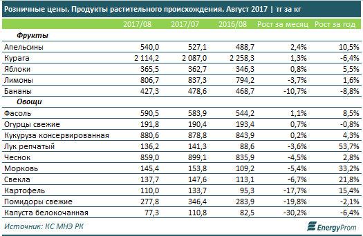 Среди фруктов в августе ощутимо (более, чем на 1%) выросли в цене только несезонные апельсины: +2,4%, до 540 тг за кг, и курага: +1,3%, до 2114,2 тг за кг.