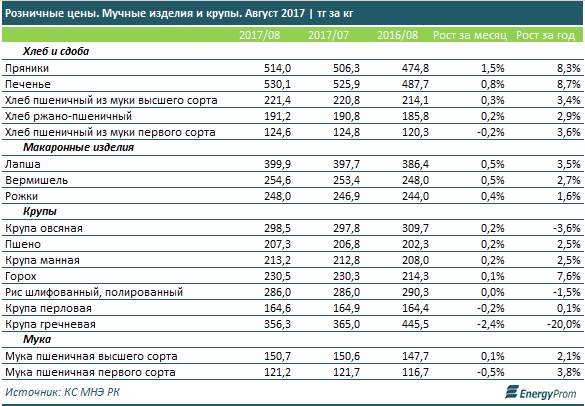 Цены на крупы практически не изменились, кроме гречки, которая вновь заметно подешевела: -2,4% за месяц (напоминаем, в июле цена на эту крупу уже падала на 3,8% к июню).