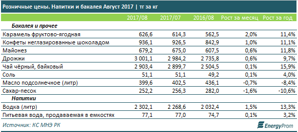 Среди продуктов животного происхождения сильнее всего за месяц подорожала молочка. Так, сыр вырос в цене к июлю сразу на 2%, до 2,15 тыс. тг, сырое молоко, сметана и маргарин — на 0,7-1,3%, пастеризованное молоко, кефир, сливочное масло и спред, а также творог — на 0,4-0,6%.