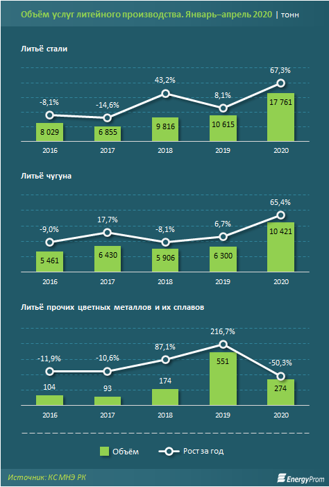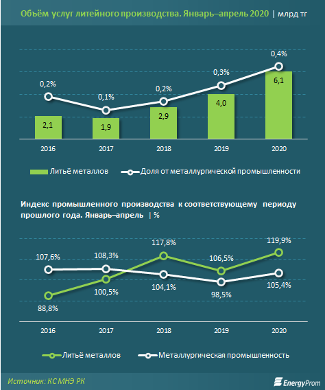 Услуги литейного производства за январь–апрель 2020 года достигли 6,1 млрд тг, увеличившись за год на 50,7%. Индекс промышленного производства к прошлому году в секторе составил 119,9%, против ИПП металлургической промышленности в целом, равного 105,4%.