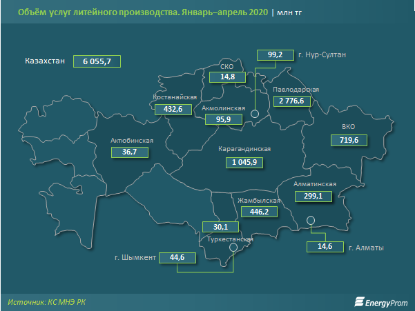 Среди регионов РК самый большой объём услуг литейного производства ожидаемо зафиксирован в Павлодарской области: 2,8 млрд тг — на 79,3% больше, чем в прошлом году. Следом идут Карагандинская (1 млрд тг) и Восточно-Казахстанская (719,6 млн тг) области.