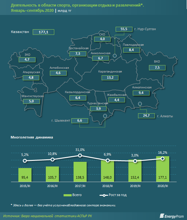 За январь–сентябрь 2020 года в сфере спорта, организации отдыха и развлечений компании оказали услуги на 178 млрд тг — на 16,8% больше в стоимостном выражении, чем в прошлом году. Реальный рост составил 11,8%.