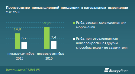 Предприятия рыбного хозяйства интенсивно наращивают объемы лова и переработки. На рынок поставили 20,8 тысячи тонн рыбы (свежая, охлажденная или мороженная). Годовой рост — 40,8%. Объем переработанной рыбы — 7,4 тысячи тонн, на 9,5% больше, чем за январь-сентябрь 2015 года.