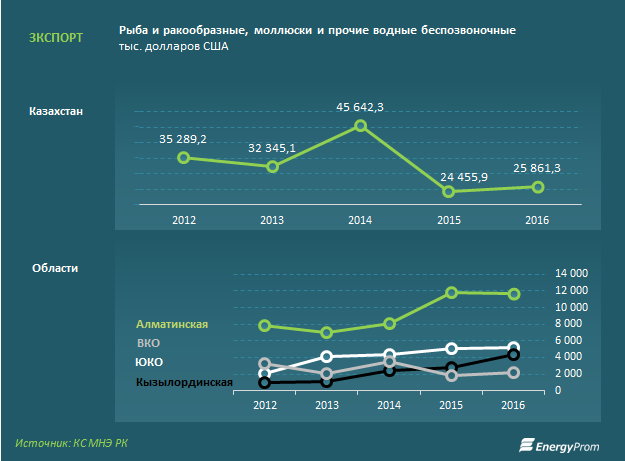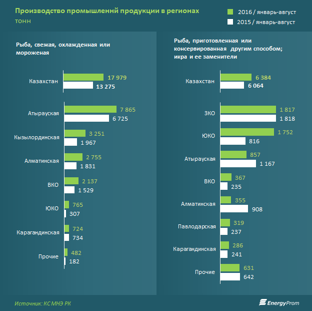 Более 40% рыбного рынка республики закрывает Атырауская область. За январь-август 2016 года регион выдал на рынок почти 8 тысяч тонн. Крупнейшие регионы по рыбной продукции — Западно-Казахстанская область — 1,8 тысячи тонн (28,5% рынка) и Южно-Казахстанская область — 1,7 тысячи тонн (27,4% рынка).