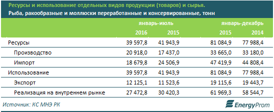 На внутреннем рынке спрос на рыбу сократился на 10,5% за счет сокращения потребления импортной продукции (с 24,5 тыс. тонн за январь-июль 2015 года до 18,7 тысячи тонн январь-июль 2016).