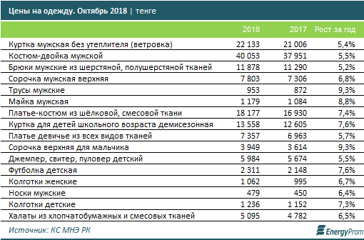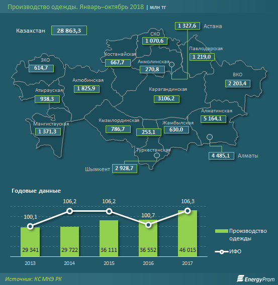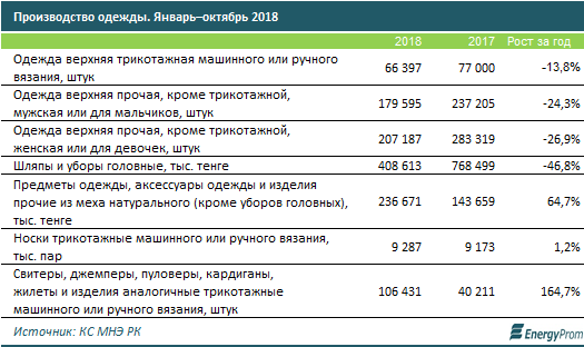 Производство одежды за 10 месяцев 2018 года сократилось на 8,6% и в стоимостном выражении составило 28,9 млрд тг.