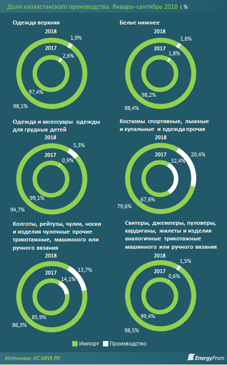 По итогам 9 месяцев 2018-го доля казахстанского производства в сегменте одежды сколько-нибудь значима лишь в сегментах спортивных и купальных костюмов (20,4%, однако доля в аналогичном периоде 2017 года была выше — 32,4%); носочно-чулочных изделий (13,7%, доля также уменьшилась в сравнении с прошлым годом — 14,1%) и одежды для грудных детей (5,3%, доля значительно увеличилась по сравнению с прошлым годом — 0,9%). Во всех прочих сегментах казахстанские производители перекрыли лишь 1–2% спроса.