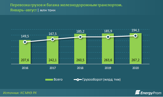 За январь–август текущего года железнодорожным транспортом перевезли 267,2 млн тонн груза и багажа — на 1,4% больше, чем годом ранее. Непосредственно за август грузоперевозки составили 35,2 млн тонн, сократившись на 0,7% по сравнению с июлем 2020-го и на 2,3% — по сравнению с августом прошлого года.