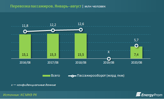 В сегменте пассажирских перевозок по итогам 8 месяцев по железной дороге перевезено 7,4 млн человек — на 49,6% меньше, чем годом ранее. В то же время непосредственно за август перевезли 828,9 тыс. пассажиров — на 16,9% больше, чем месяцем ранее. Пассажирооборот составил 5,7 млрд пкм — на 53% меньше, чем годом ранее. В августе показатель составил 709,1 млн пкм, увеличившись на 18,3% по сравнению с июлем.