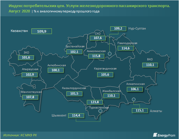 Услуги пассажирского железнодорожного транспорта в августе подорожали на 9,9%. Сильнее всего среди регионов ощутили рост цен жители Туркестанской области: годовое удорожание составило 23,8%. Также заметно выросли цены в Акмолинской области (на 15,8%) и в Алматы (на 15,1%).
