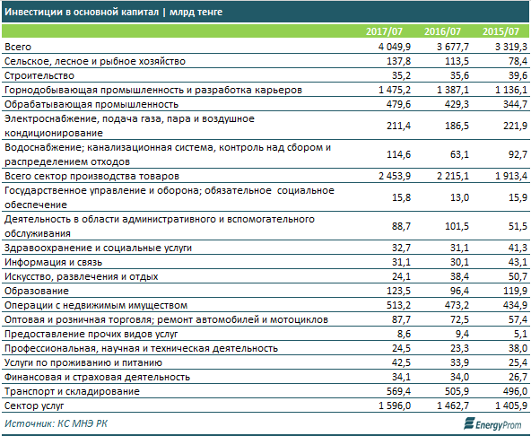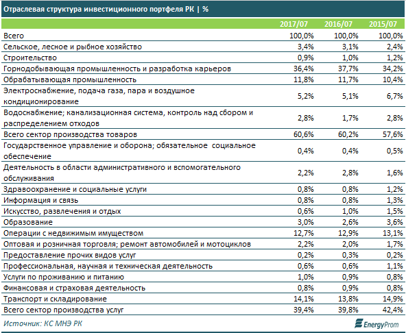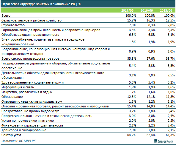 Отраслевая структура привлеченных инвестиций показывает, что интерес к сервисной экономике падает. Удельный вес услуг в портфеле за два года сократился на 3% до 39,4. Между тем это самый емкий сектор с точки зрения генерации рабочих мест. По итогам первого полугодия 2017 года в сервисном сегменте экономики работает почти 5,5 миллионов человек — это 64,2% от всего занятого населения Казахстана.