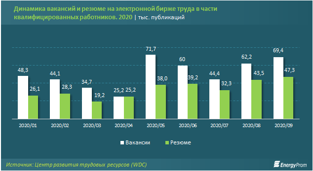 В третьем квартале текущего года на электронной бирже труда (ЭБТ) было размещено 176 тыс. вакансий для квалифицированных работников — на 12,2%, или 19,1 тыс., больше, чем во втором квартале. Количество размещённых резюме достигло 123,1 тыс., увеличившись по сравнению со вторым кварталом сразу на 20,2%. В целом в связи с введением карантина наблюдалось снижение спроса и предложения в июле, но после поэтапного ослабления карантинных мер в августе наметилась тенденция роста числа вакансий и резюме.