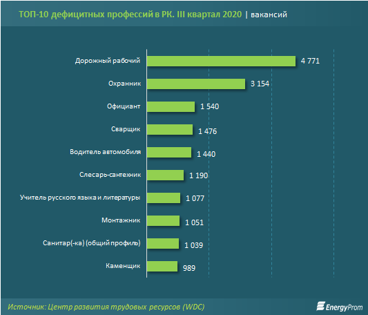 Самые дефицитные профессии в третьем квартале 2020 года — дорожный рабочий (количество вакансий превышает число резюме на 4,8 тыс.), охранник (на 3,2 тыс.), официант (на 1,5 тыс.), сварщик (на 1,5 тыс.) и водитель автомобиля (на 1,4 тыс. вакансий).