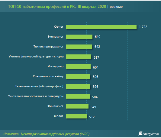 Тем временем наиболее избыточные профессии в Казахстане — юрист (число резюме от соискателей превышает количество вакансий на 1,7 тыс.), экономист общего профиля (на 649 резюме), техник-программист (на 642 резюме), учитель физической культуры и спорта (на 617 резюме) и фельдшер (на 604 резюме).