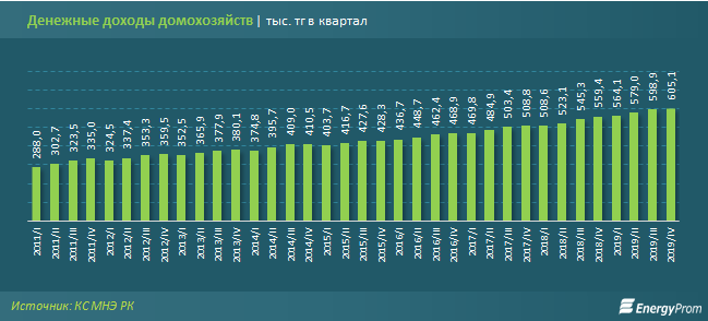 Напомним, в IV квартале прошлого года денежные доходы казахстанских домохозяйств составляли 605,1 тыс. тг, против 598,9 тыс. тг кварталом ранее, и 559,4 тыс. тг — год назад.
