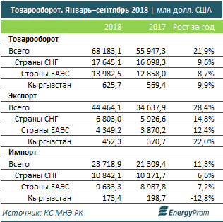 За 9 месяцев 2018 года экспорт из Казахстана в Кыргызстан увеличился сразу на 22% и составил 452 млн долл. США. Наибольший рост наблюдался в топливно-энергетических товарах (в 2,5 раза за год), а наибольшее снижение — в кожевенном сырье, пушнине и изделиях из них (−73,7%).