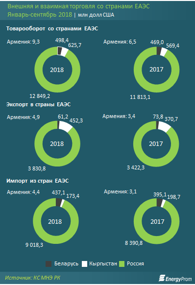 За январь–сентябрь 2018 года основная доля в товарообороте со странами ЕЭАС традиционно принадлежит России — почти 92%. На втором месте Кыргызстан (4,5% от товарооборота), на третьем — Беларусь (3,6%).