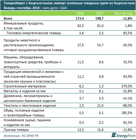 Импорт товаров из Кыргызстана за 9 месяцев составил 173,4 млн долл. США, что сразу почти на 13% меньше, чем в аналогичном периоде 2017 года. Наибольший рост наблюдался в поставках строительных материалов — почти в 5 раз. А вот поставки текстильных изделий снизились на 88% в сравнении с январём–сентябрём 2017 года.