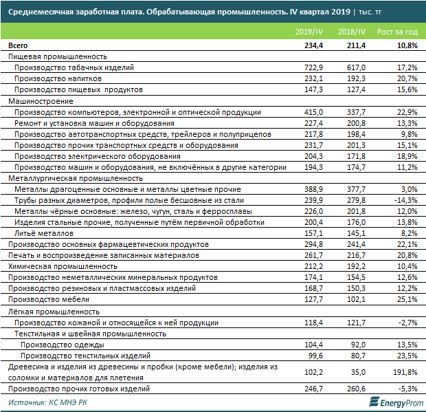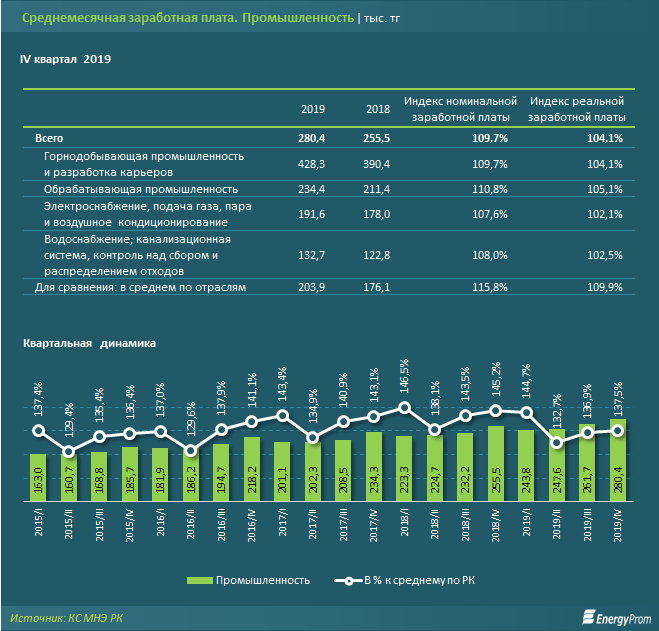 Промышленность — одна из самых высокооплачиваемых отраслей в Казахстане. При среднемесячной заработной плате одного сотрудника в четвёртом квартале 2019 года в 203,9 тыс. тг работники промсектора получали в среднем 280,4 тыс. тг (на 37,5% больше). Рост заработных плат в отрасли составил 9,7% за год, увеличение покупательной способности — 4,1%.