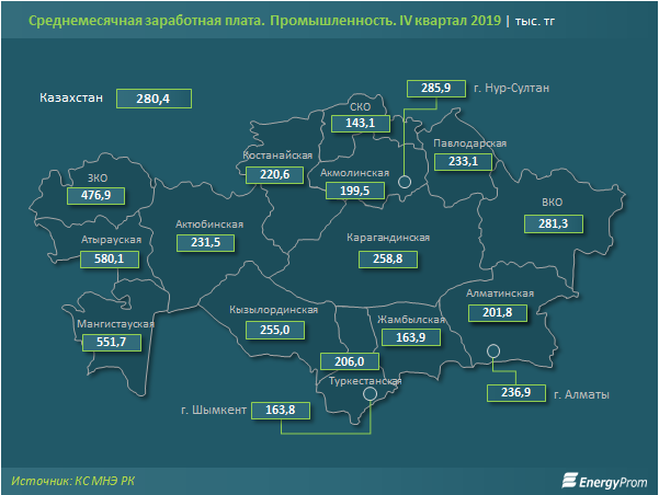 В региональном разрезе промышленники традиционно зарабатывают больше всего в «добывающих» нефтегазовых регионах: Атырауской (580,1 тыс. тг, +9,5% за год), Мангистауской (551,7 тыс. тг, +6,8% за год) и Западно-Казахстанской (476,9 тыс. тг, +16,7% за год) областях.