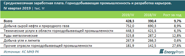 Самые высокие зарплаты в горнодобывающей промышленности ожидаемо получают работники сегмента добычи нефти и газа: 752 тыс. тг — на 8,9% больше, чем годом ранее.