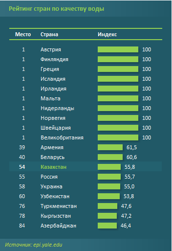 В рейтинге стран мира по качеству воды, учитывающем клинически зарегистрированные случаи любого ущерба здоровью, к которым могло иметь отношение качество потребляемой воды, Казахстан занял 54-е место из 179. Индекс качества питьевой воды* в РК составил 55,8 (из 100).