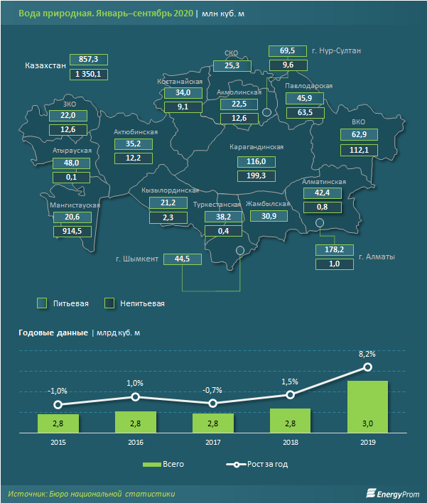 Объём поставляемой казахстанцам природной воды за январь–сентябрь 2020 года составил 2,2 млрд куб. м — на 0,7% больше, чем годом ранее. Для справки: за полный 2019 год показатель составил 3 млрд куб. м — на 8,2% больше, чем в предыдущем году.