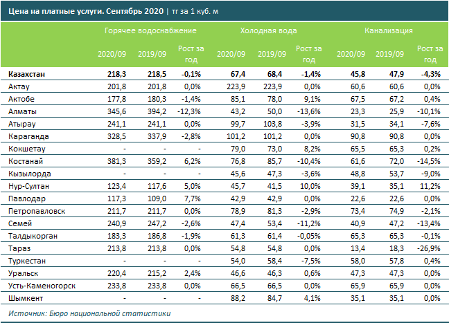 В сентябре 2020 года услуги горячего водоснабжения обходились на 0,1% дешевле, чем годом ранее: 218,3 тенге за куб. метр. Холодная вода в среднем по городам РК подешевела на 1,4%, до 67,4 тг за куб. м, услуги канализации — на 4,3%, до 45,8 тг за куб. м.