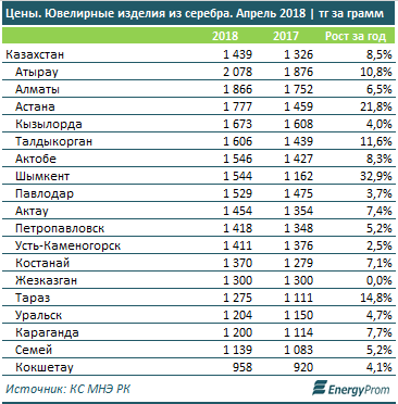 Ювелирные изделия из серебра подорожали примерно также, как и золотые — плюс 8,5% год-к-году, до 1,4 тыс. тг за грамм.