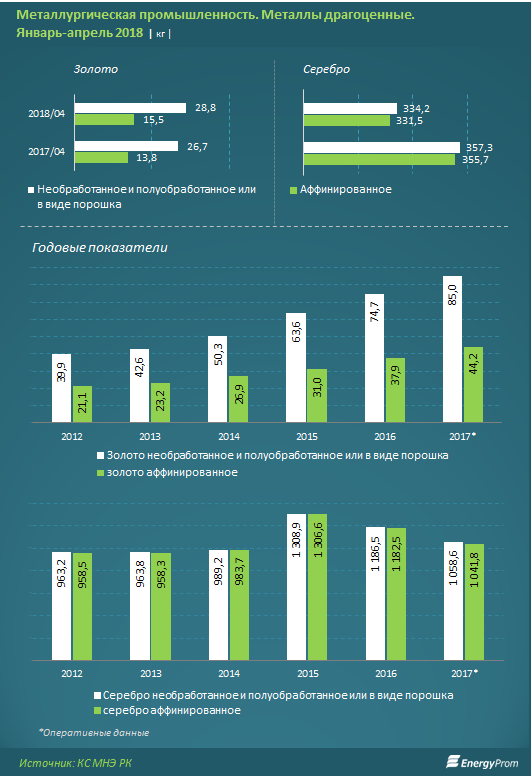 Производство серебра продолжает сокращаться — всего 334,2 тонны за январь-апрель 2018, на 6,5% меньше, чем годом ранее; из них 331,5 тонны — аффинированного, на 6,8% меньше, чем год назад.