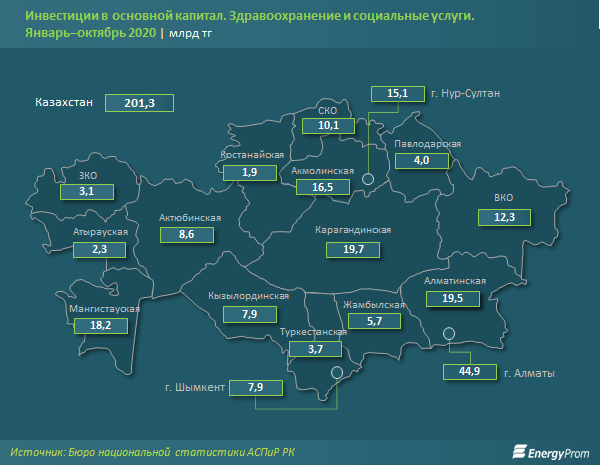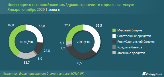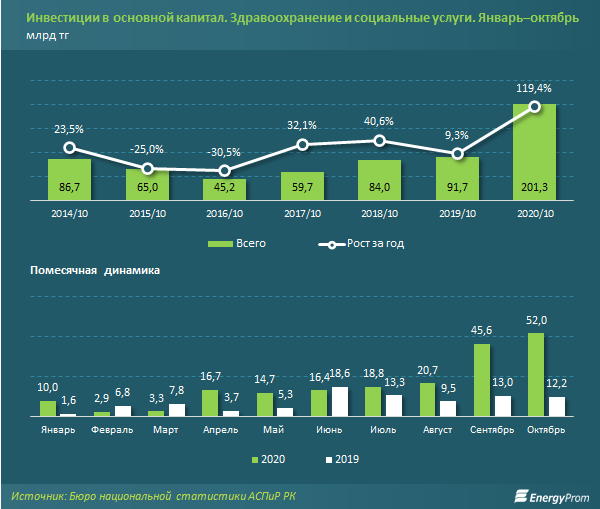 За январь–октябрь 2020 года в сферу здравоохранения и социальных услуг в РК проинвестировали 201,3 млрд тг — сразу в 2,2 раза больше, чем годом ранее. ИФО составил 217,2%.